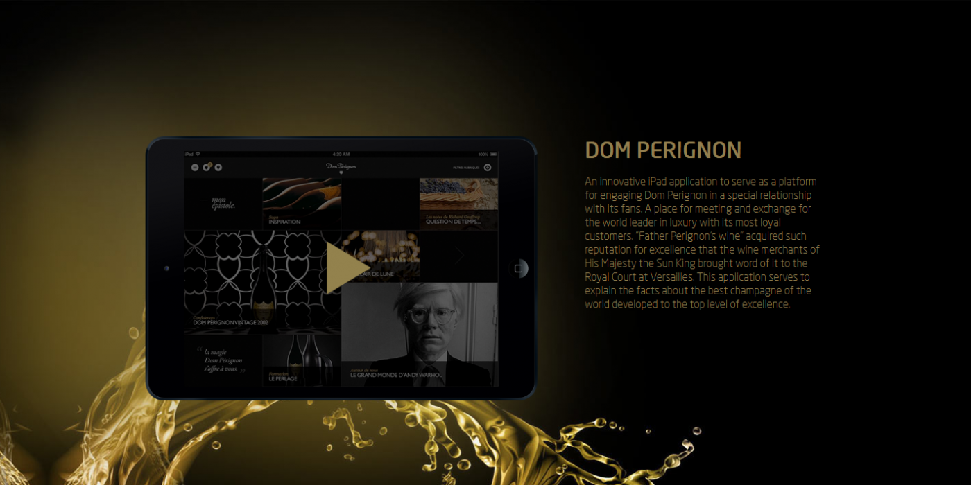 An innovative iPad application to serve as a platform for engaging Dom Perignon in a special relationship with its fans. A place for meeting and exchange for the world leader in luxury with its most loyal customers. “Father Perignon’s wine” acquired such reputation for excellence that the wine merchants of His Majesty the Sun King brought word of it to the Royal Court at Versailles. This application serves to explain the facts about the best champagne of the world developed to the top level of excellence.